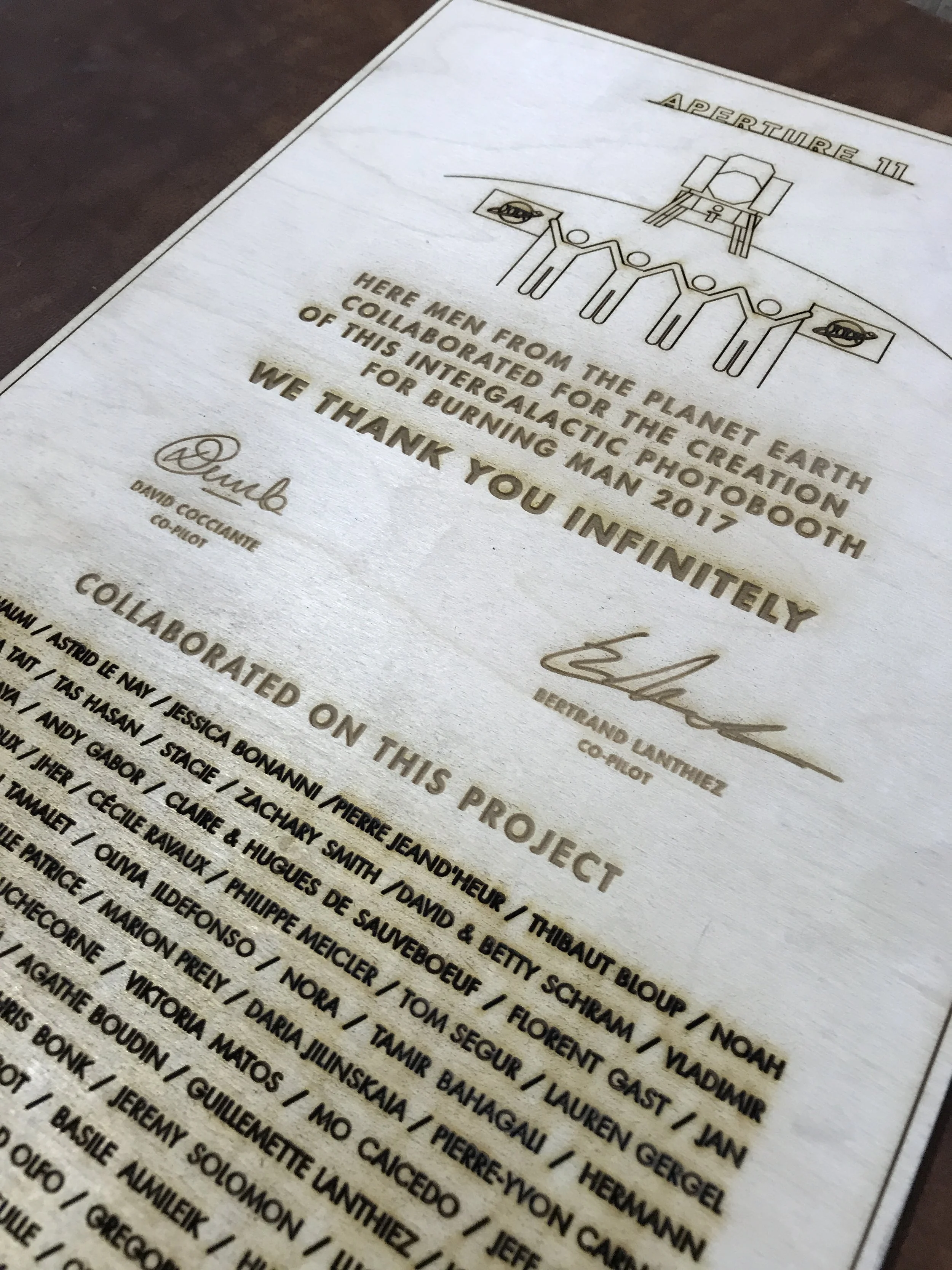With Bertrand Lanthiez, we designed and built Aperture 11, an interactive installation presented at Burning Man 2017 as part of the Honoraria Grant program. Inspired by the Apollo 11 lunar module, the piece invited participants to complete an electrical circuit by holding two flags, triggering a camera to capture their photo. Each black-and-white print included a QR code linking to its digital version, creating a living archive of over 600 portraits. The installation blended play, technology, and community… turning a symbolic space exploration into a shared human moment on the playa.